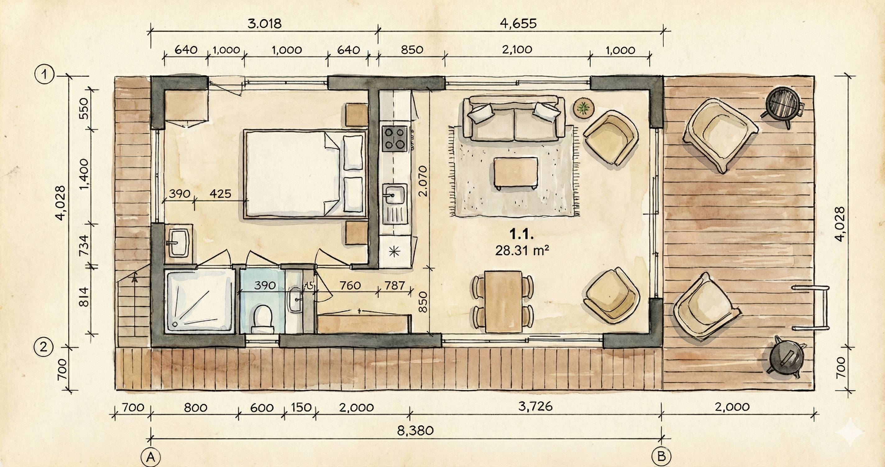- 34 m² woonoppervlak met ruim voor- en achter terras 9 m²